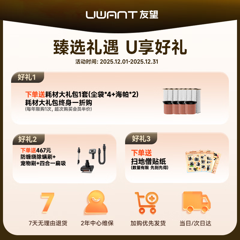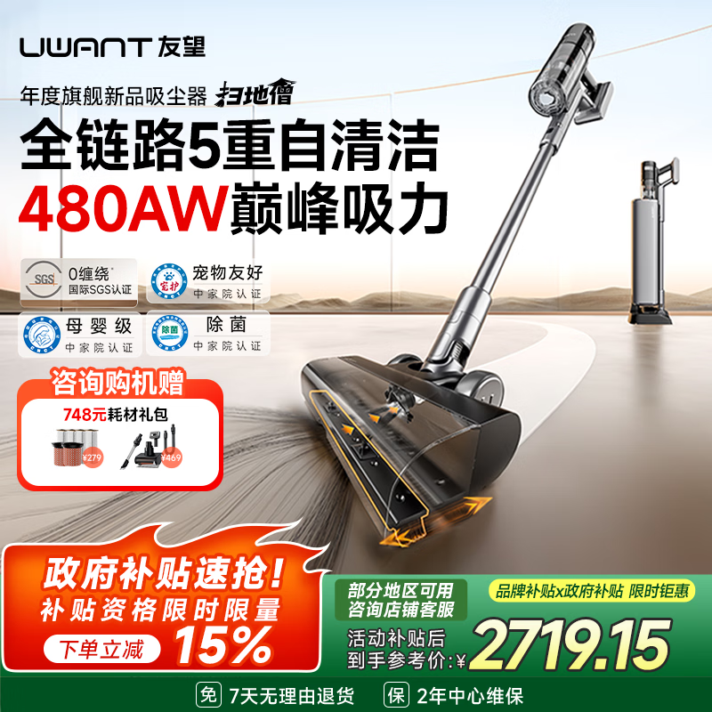 UWANT友望吸尘器扫地僧【维嘉同款】超强大吸力自清洁自集尘【全链防缠绕】家用无线手持扫地不缠发