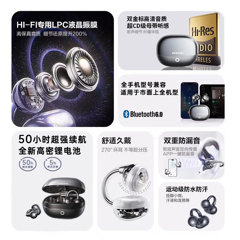 UPROMIX【2025新款|全网热销百万】蓝牙耳机耳夹式骨传导概念不入耳无线耳机运动跑步长续航开放式不伤耳 【AI顶配版】星空黑丨千元级专用喇叭 【全型号兼容】适用于市面上全机型
