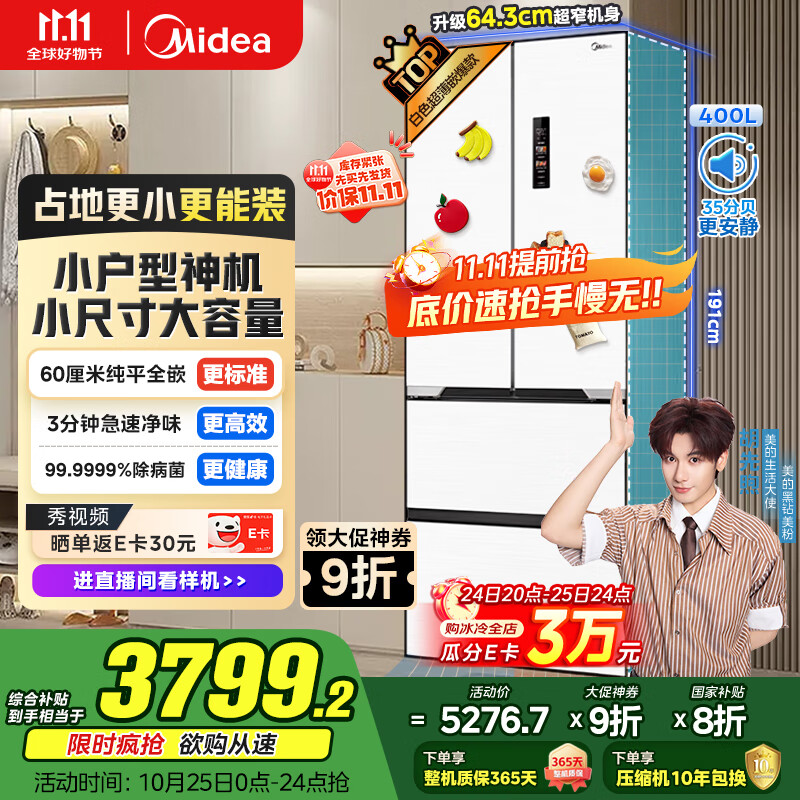 美的(Midea)421法式多门超薄纯平全嵌除菌净味一级能效风冷无霜变频国家补贴20%家用冰箱MR-421WUFPZE底部散热