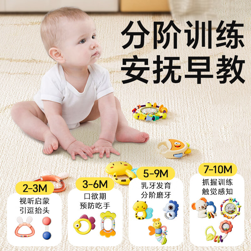 babycare动物乐园摇铃牙胶婴儿玩具0-6个月抓握听力训练新生儿见面礼8件套