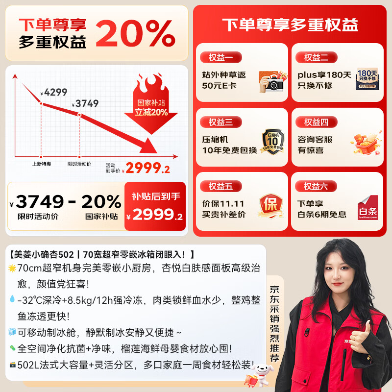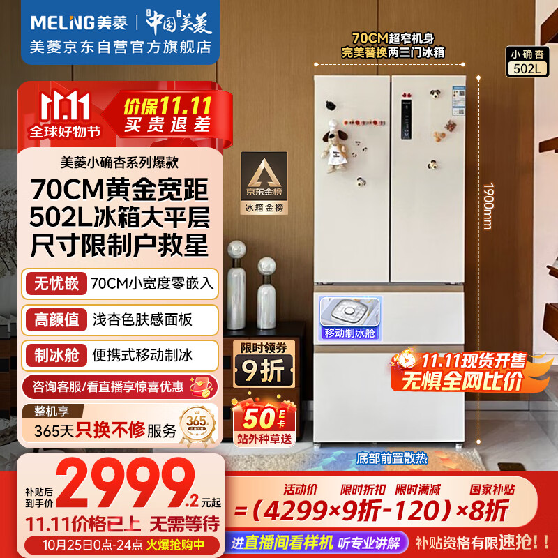 美菱(MeiLing)小确杏502升法式四开门冰箱70cm宽制冰超薄嵌入大容量变频底部散热国家补贴BCD-502WFP9CZX杏悦白