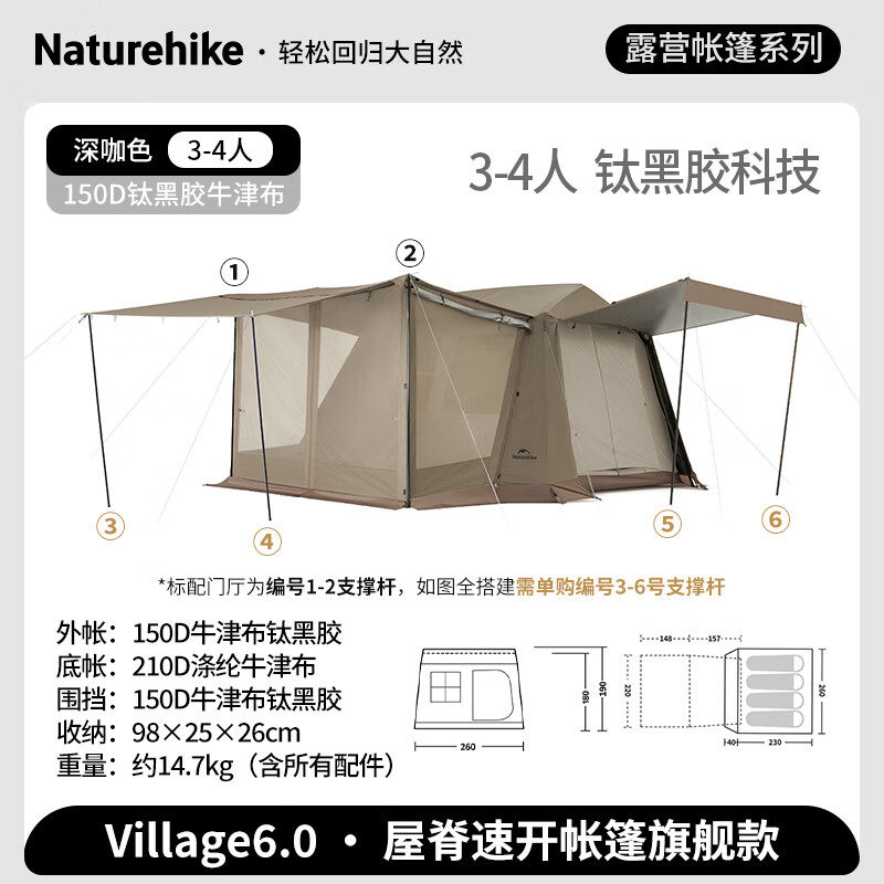 Naturehike挪客Village 6.0屋脊旗舰版速开帐篷天幕户外露营钛黑胶防晒防雨
