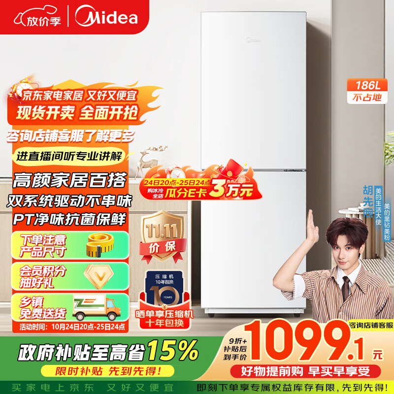 美的(Midea)195两门二门双开门低噪租房小型家用电冰箱风冷无霜小冰箱MR-195WE不串味以旧换新【国家补贴】