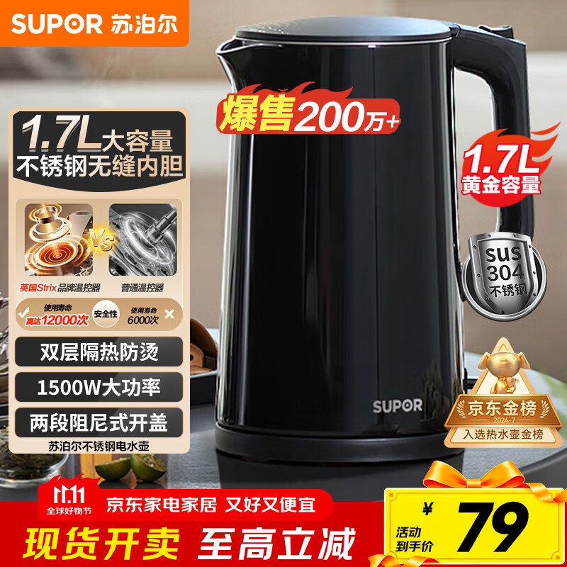 苏泊尔(SUPOR)电水壶 双层防烫烧水壶热水壶1.7L大容量 全钢无缝内胆304不锈钢电热水壶SW-17J419