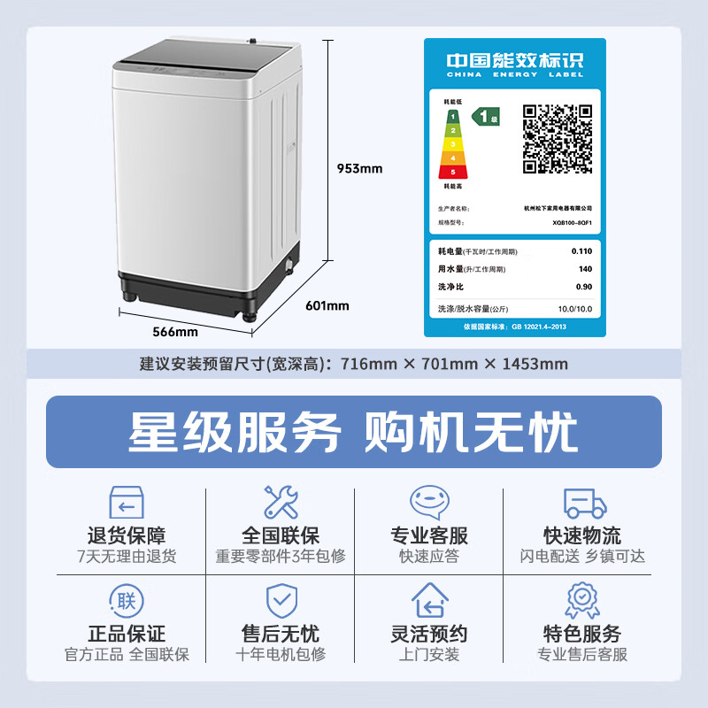 松下(Panasonic)【吴磊推荐】波轮洗衣机全自动10公斤大容量 抗菌除螨智能桶洗净 内衣洗衣机国家补贴XQB100-8QF1