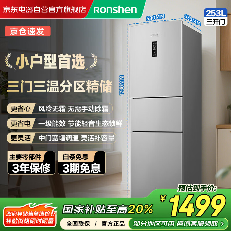 容声253升一级能效三开门小电冰箱家用小型变频风冷无霜节能省电净味出租房国家补贴BCD-253WD12NP