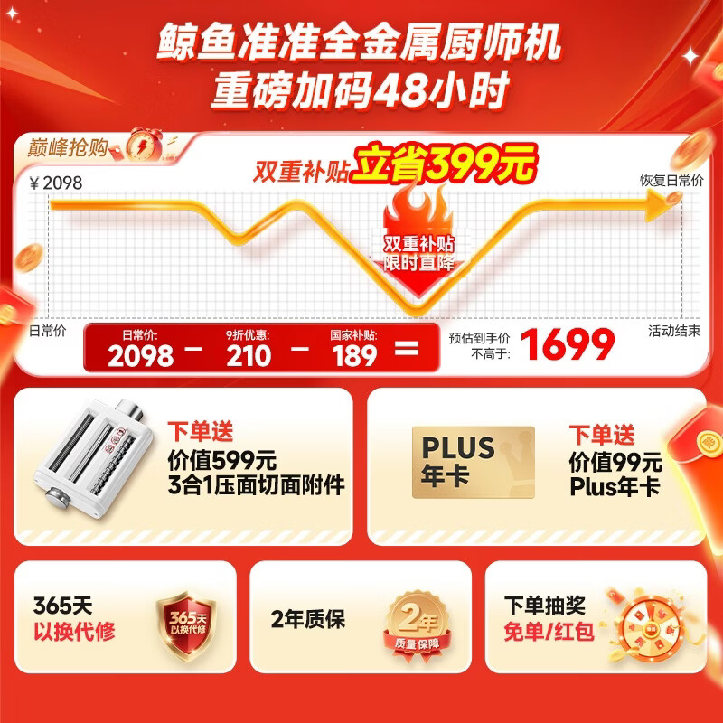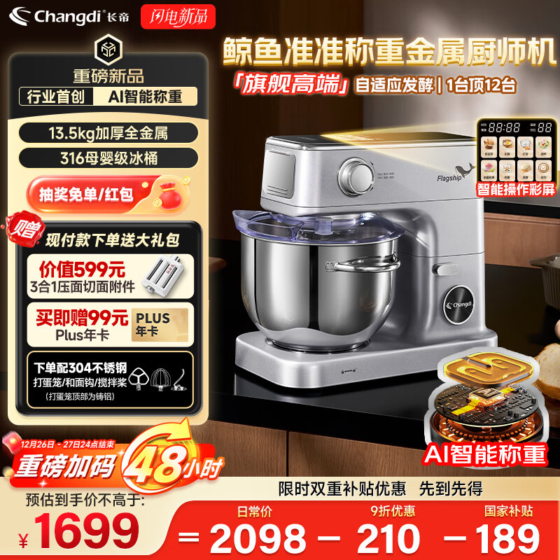 长帝(changdi)国家补贴新品家用厨师机和面机鲸鱼准准发酵称重316母婴级冰桶金属机身全自动揉面压面多功能料理
