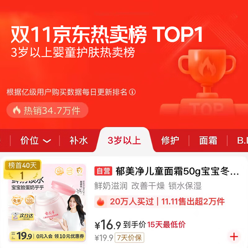 郁美净儿童面霜50g宝宝冬季面霜保湿滋润防干裂乳液补水润肤擦脸油