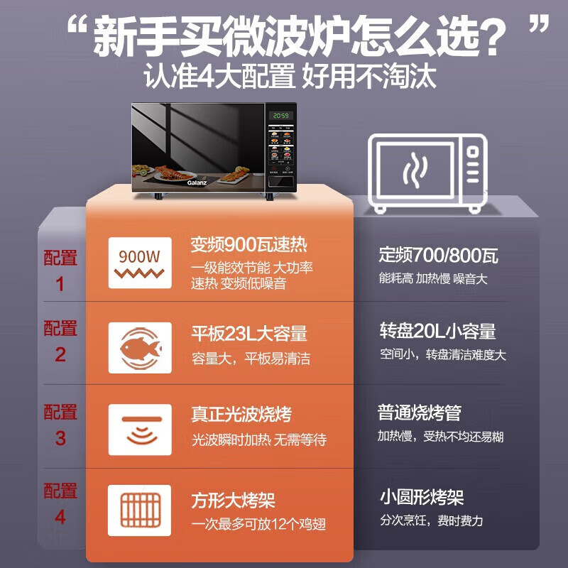 格兰仕(Galanz)变频微波炉烤箱一体机光波炉900瓦大功率速热家用23L大容量平板易清洁省电一级能效智能菜单烧烤 2026新升级彩膜BM1(S2)