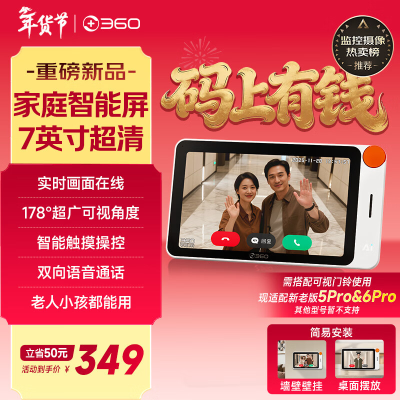 360家庭智能屏7英寸高清大屏可视门铃猫眼伴侣监控摄像头智能触控双向语音通话支持挂墙桌面摆放模式