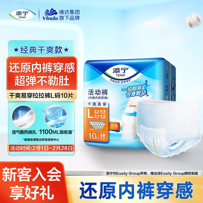 添宁(TENA)干爽成人拉拉裤L10片 (腰围:66-135cm)内裤式老年人产妇尿不湿
