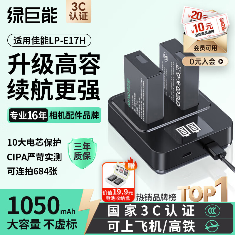 绿巨能(llano)适用佳能LP-E17H相机电池充电器套装R50/R50V/200D二代/R10/R8/750D/800D/760D/850D/R100/M3/M6