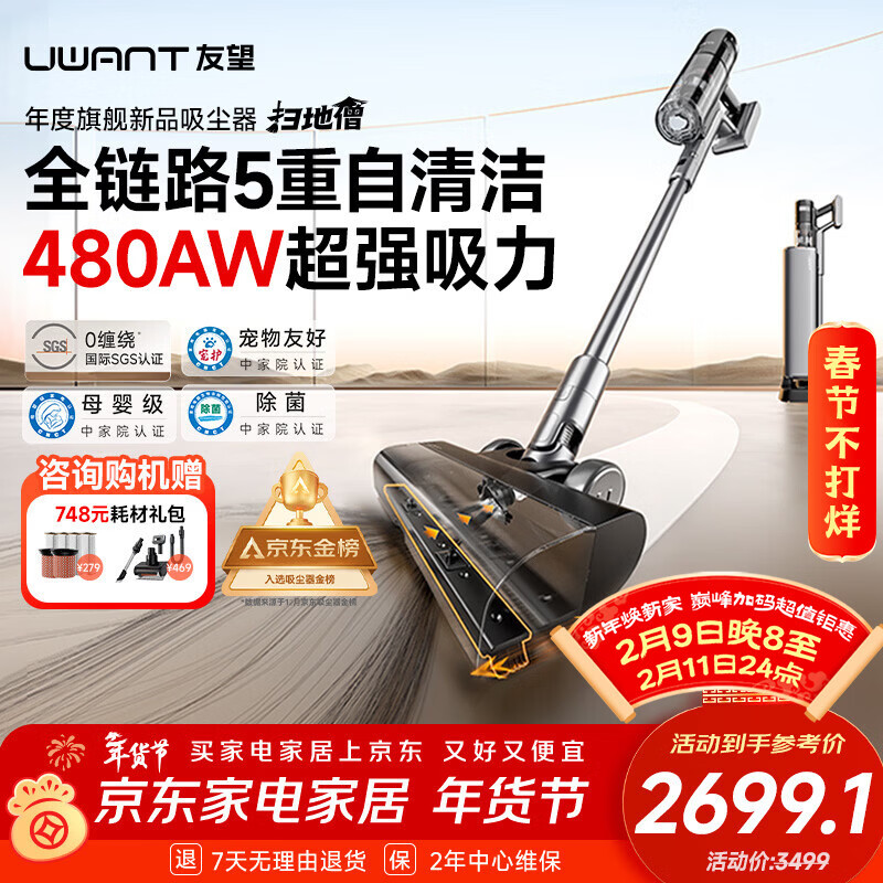 UWANT友望吸尘器扫地僧大吸力除菌除螨自清洁自集尘【全链防缠绕】家用无线手持扫地不缠发