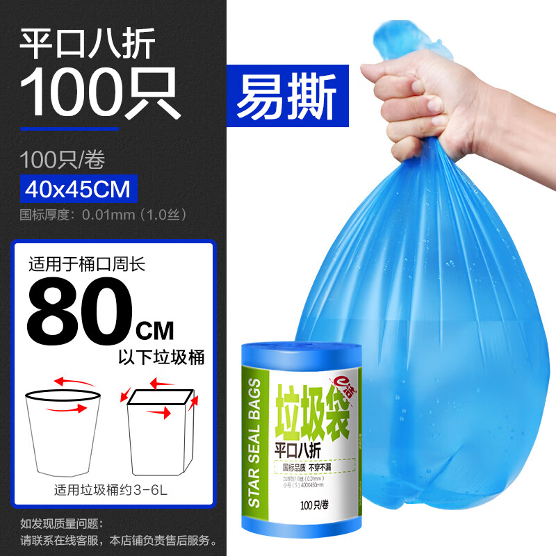e洁 自动收口垃圾袋加厚抽绳手提式酒店学校企业定制 100只 6升40*45cm易撕 蓝色平口