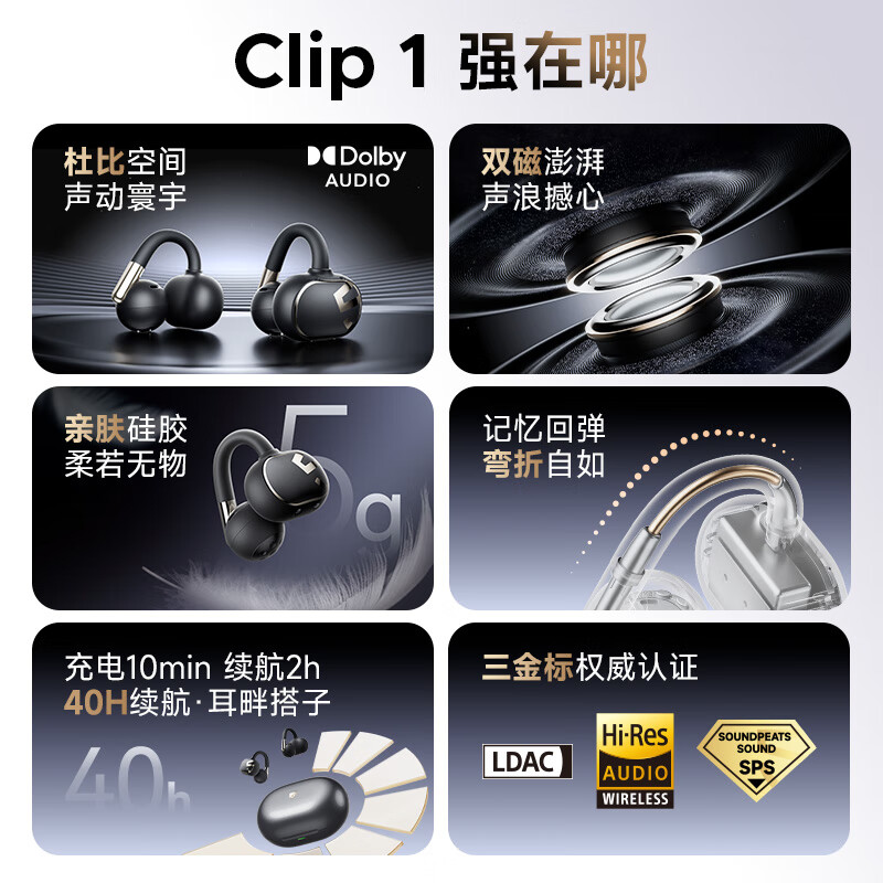 SoundPEATS泥炭Clip1 【重磅新品】 杜比音效大师音质 钛动圈开放式蓝牙耳机 耳夹式耳机运动蓝牙耳机 钛空灰