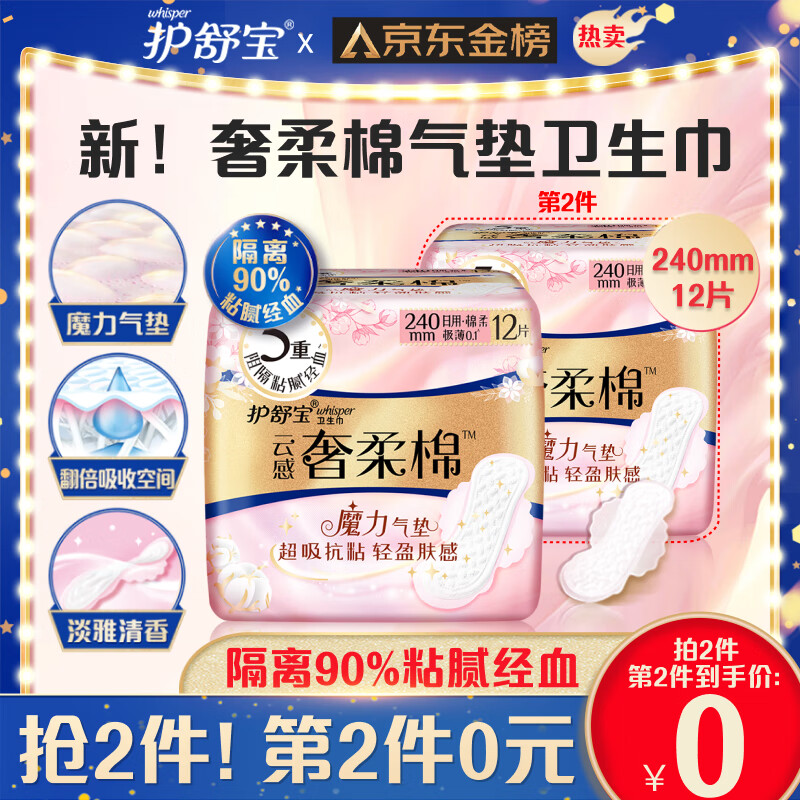 商品: 护舒宝新奢柔棉气垫卫生巾日用240mm*12片姨妈巾淡香超吸抗黏腻