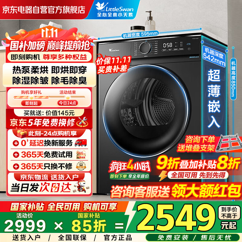 小天鹅(LittleSwan)10KG热泵烘干机节能省电 祛味空气洗除螨除菌 家用干衣机 AI正反转 超薄嵌入TH100-HL02T 国家补贴