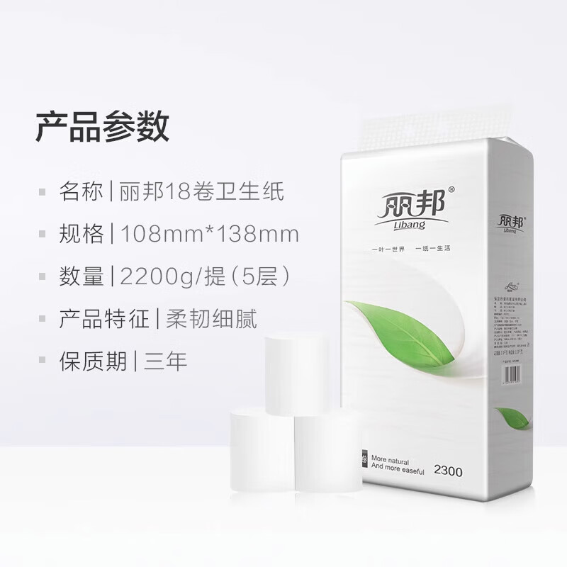 丽邦(Libang)妇婴卷纸一叶子系列五层实惠卫生纸家用厕纸无芯卷纸 5层 122g/卷*18卷 【4.4斤】