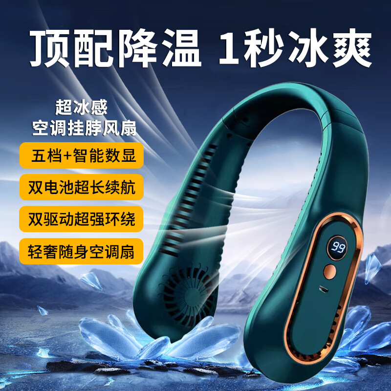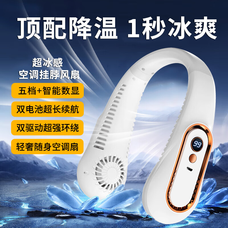 商品: 惠舟【五档双驱】挂脖风扇数显随身便携脖子制冷空调户外骑行懒人办公usb静音挂颈头戴小风扇降温神器 轻奢白顶配款丨五档数显丨超长续航 冰爽静音降温神器