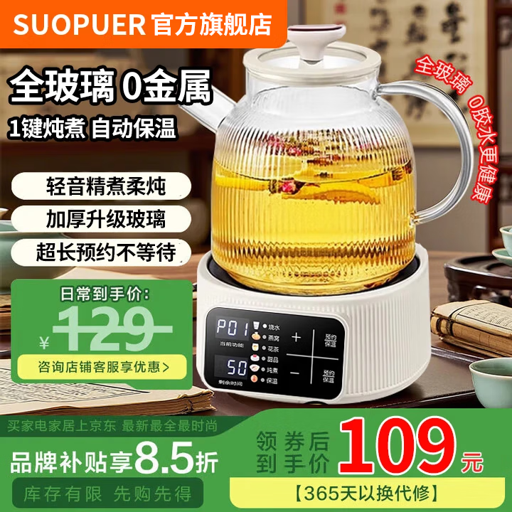 SUOPUER苏泊养生壶0胶水全玻璃煮茶壶家用花茶壶恒温水壶烧水壶电热水壶办公室保温煮茶器全自动智能 1.5L 柔音降噪+智能预约