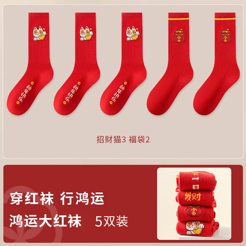 宜而爽秋冬季新年大红色中筒长袜男5双---------------------
