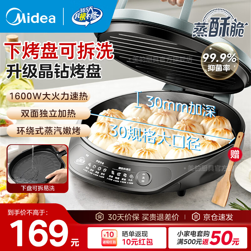 美的(Midea)电饼铛家用双面加热加深大火力上下双盘可拆洗抗菌不粘煎烙饼锅三明治早餐机蒸汽薄饼煎烤机 【30mm加深盘】下盘可拆洗JKE3067
