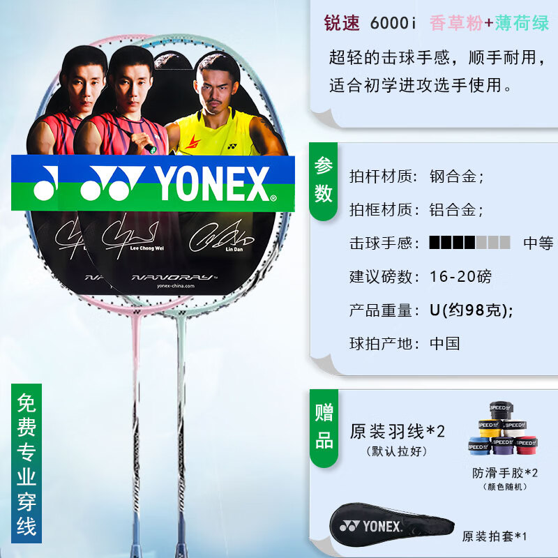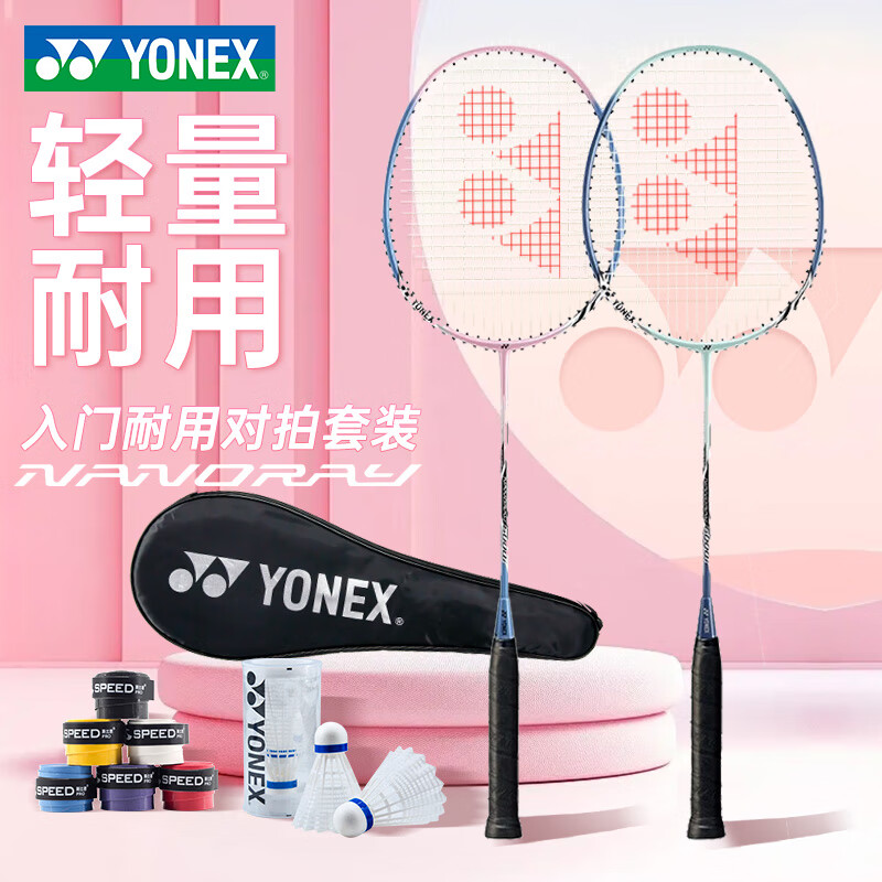 商品: YONEX尤尼克斯羽毛球拍双对拍超轻型全碳素碳纤维合金专业训练比赛 NR6000i粉红蓝对拍 (赠球)易上手 官方授权/电子防伪