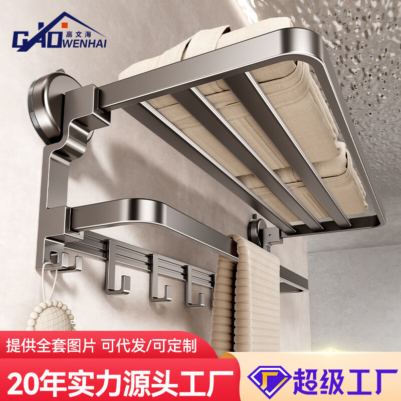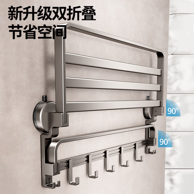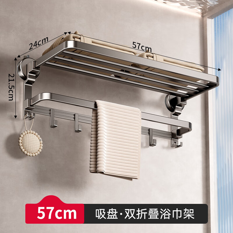 海高文海枪灰太空铝吸盘毛巾架一体卫生间浴室置物架免打孔浴巾架 豪华款枪灰60cm