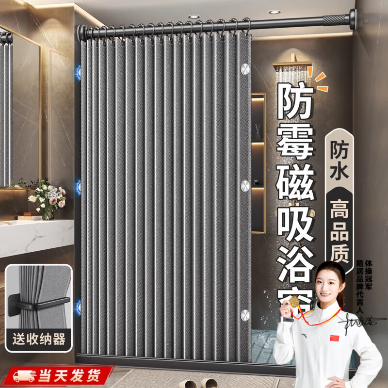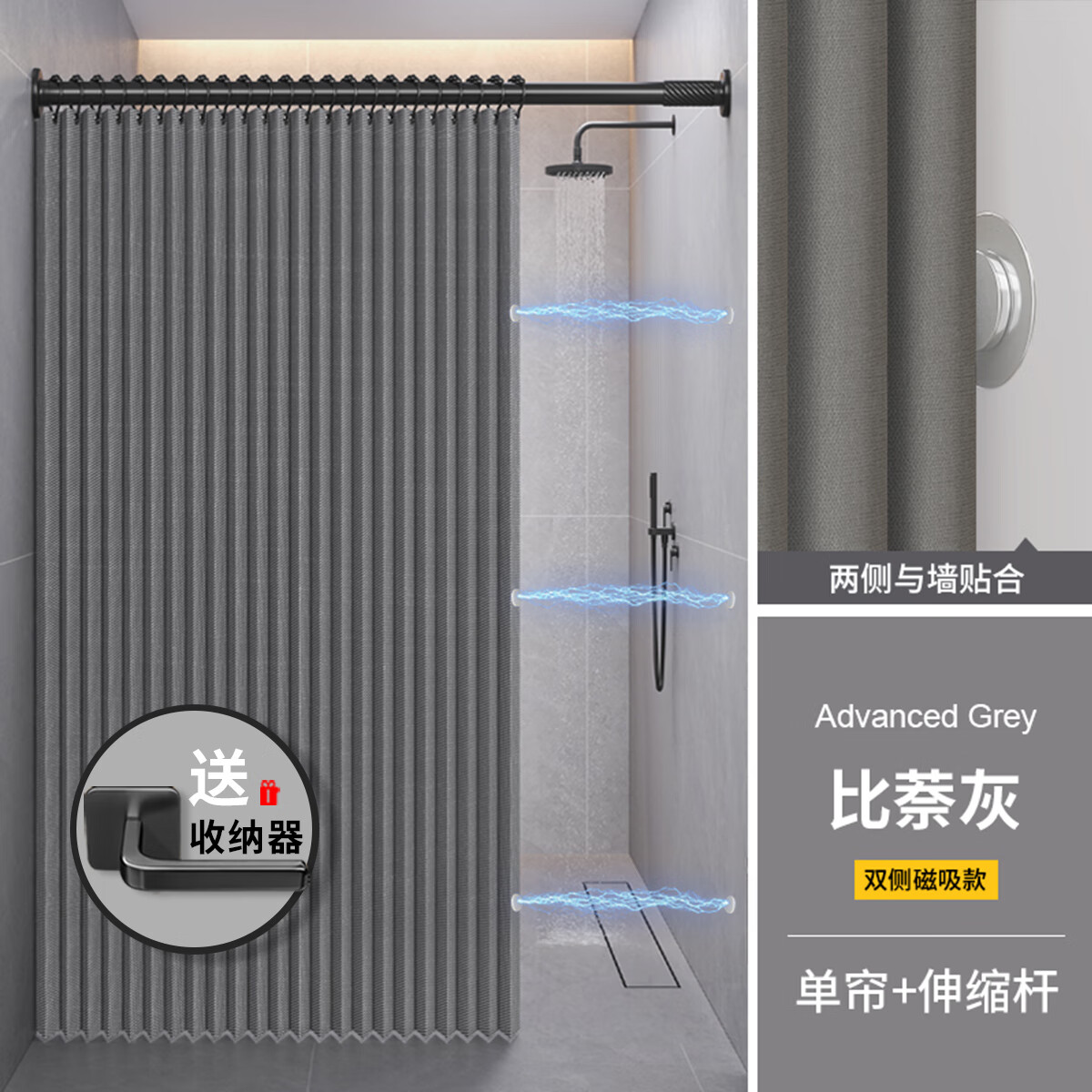 箱居磁吸折叠浴帘伸缩杆套装免打孔浴室淋浴隔断帘隐形干湿分离防水帘 比奈灰【单帘+杆子】磁吸款 适150-180墙/帘高180/杆110-200