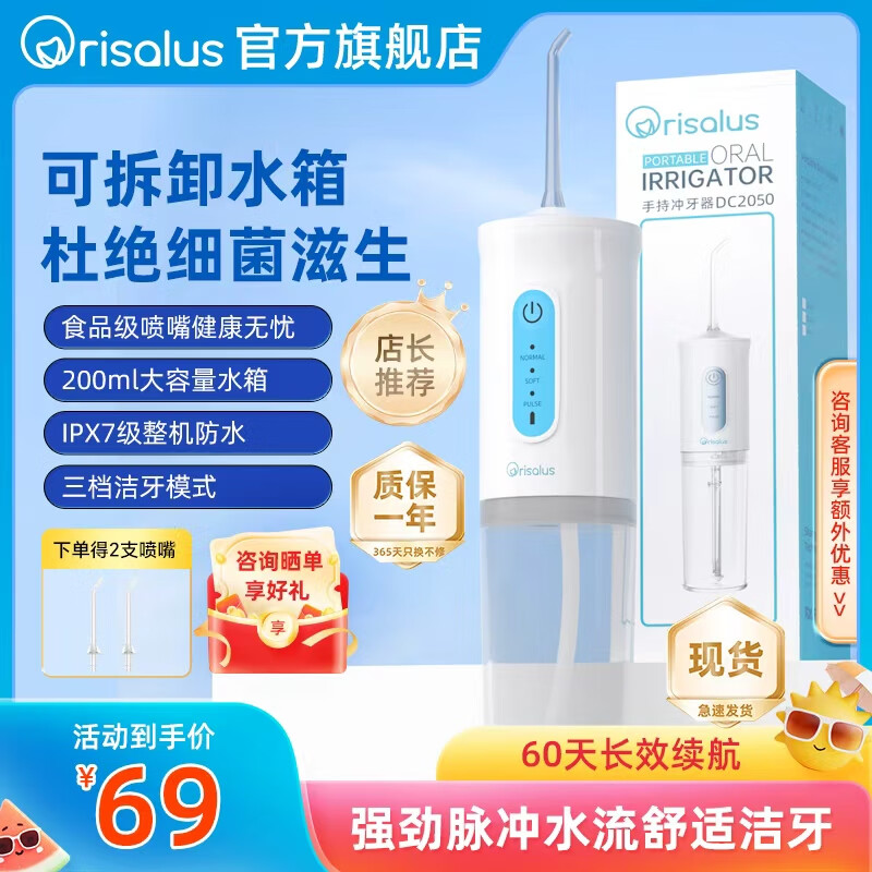 Orisalus便携冲牙器【畅销海外12年】洗牙器水牙线牙齿冲洗器清洁口腔牙缝牙黄结石洁牙器节日礼物出行必备 白色 2支喷头 脉冲水流+三档模式【超性价比款】