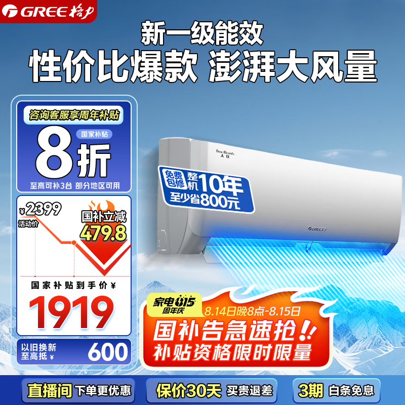 格力(GREE)空调1.5匹 天仪【云欢同款】新一级 变频冷暖 壁挂式卧室空调挂机格力官方旗舰店 家电国家补贴 1.5匹 一级能效 天仪【性价比爆款】