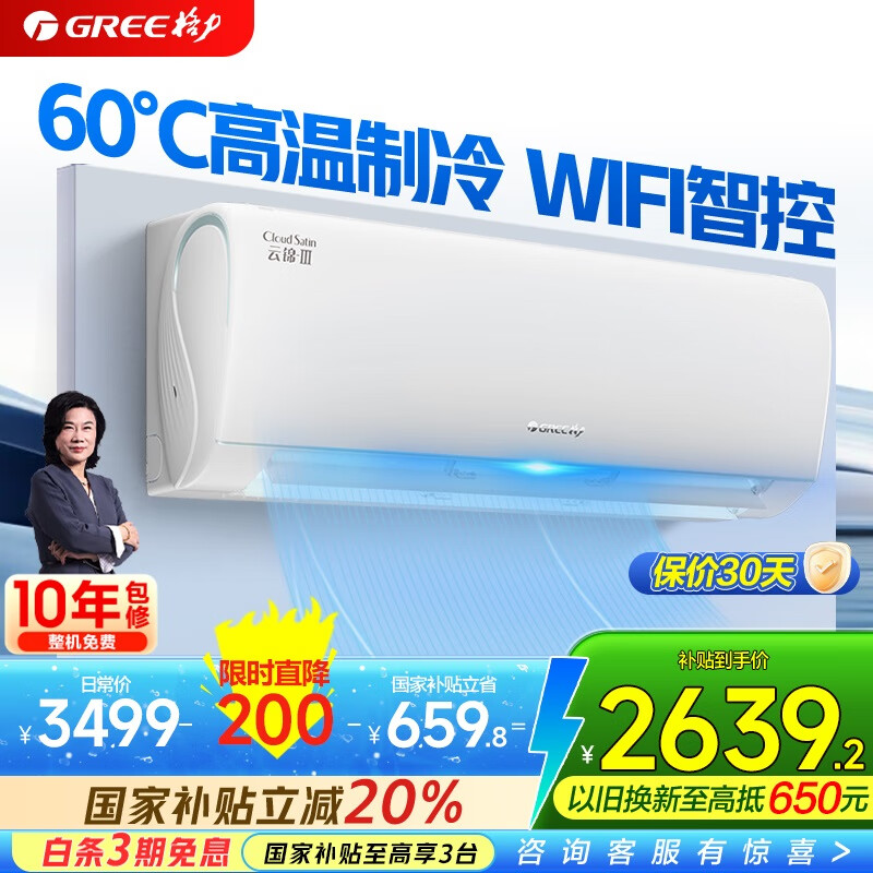 格力(GREE)空调挂机云锦三代/二代新一级能效变频冷暖巨省电 自清洁 WIFI壁挂式卧室空调挂机 国家补贴20% 1.5匹 一级能效 云锦三代新升级款