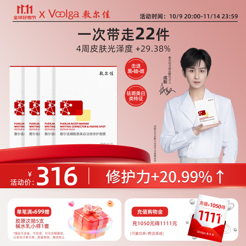 敷尔佳【成毅同款】烟酰胺美白淡斑修护面膜4盒 保湿肤色提亮 礼物女友