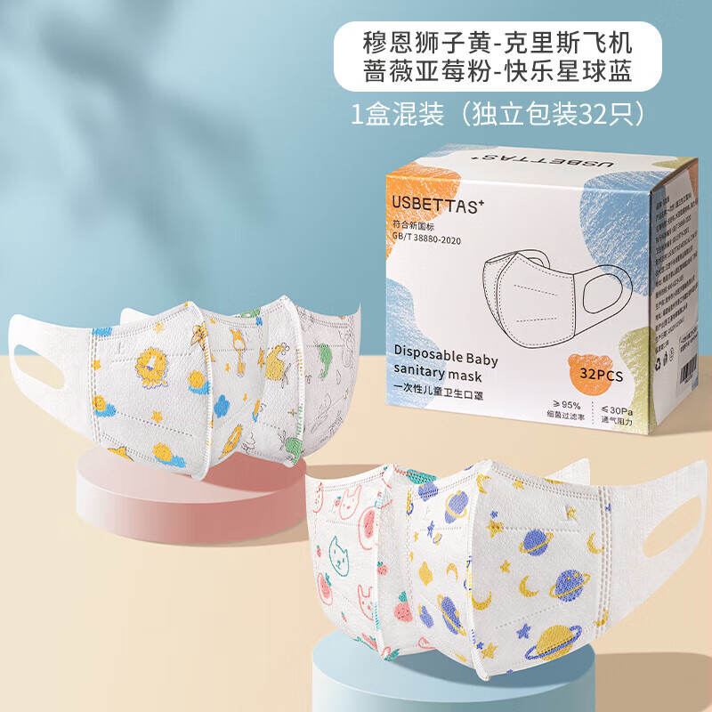 贝肽斯儿童口罩婴儿口罩3d立体一次性宝宝专用三重防护口耳罩 星球+飞机+狮子+蔷薇 混装32只 S码 0-3岁(独立包装)