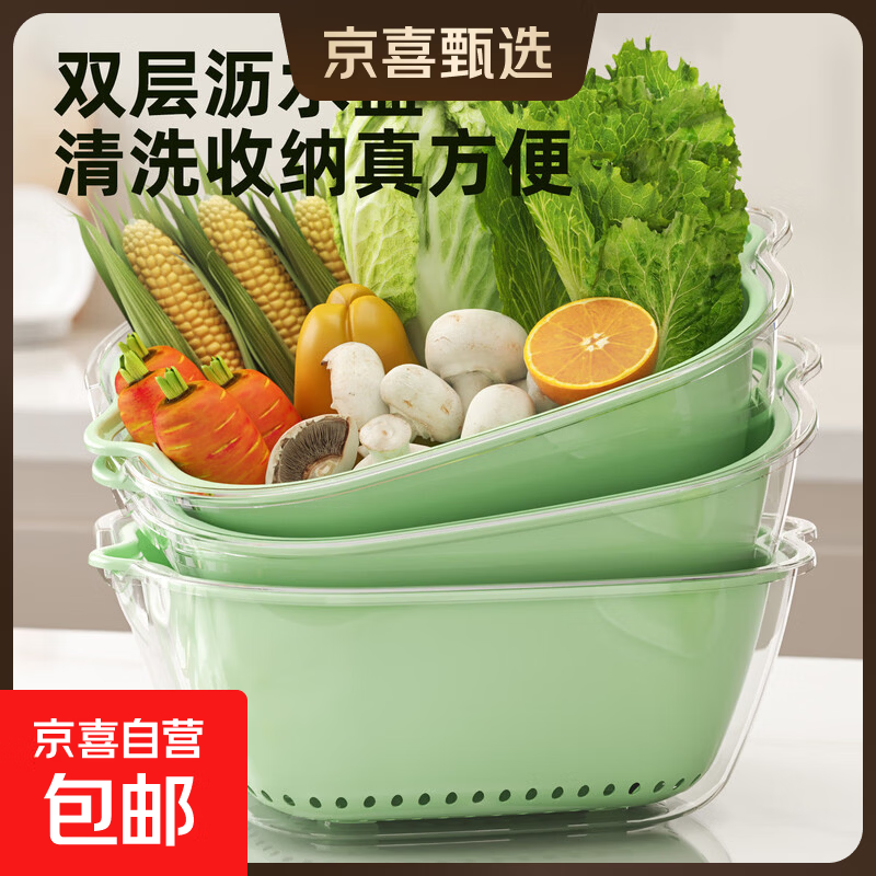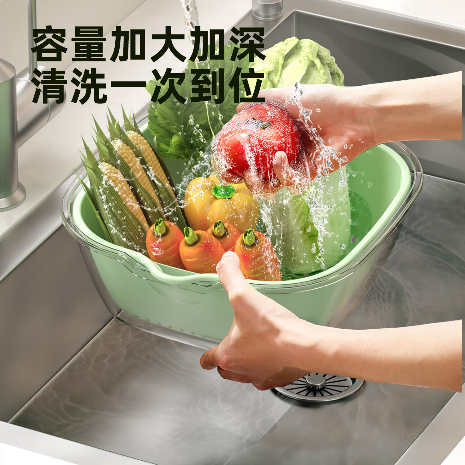 双层透明沥水篮洗菜篮家用厨房装蔬菜水果盘PET洗水果滤水篮 中+大四件套