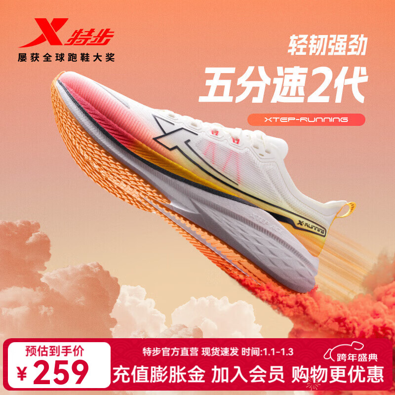 特步(XTEP)五分速2代跑步鞋男女款运动鞋跑鞋马拉松训练缓震回弹体测鞋子2.0 帆白/激光红(男) 42