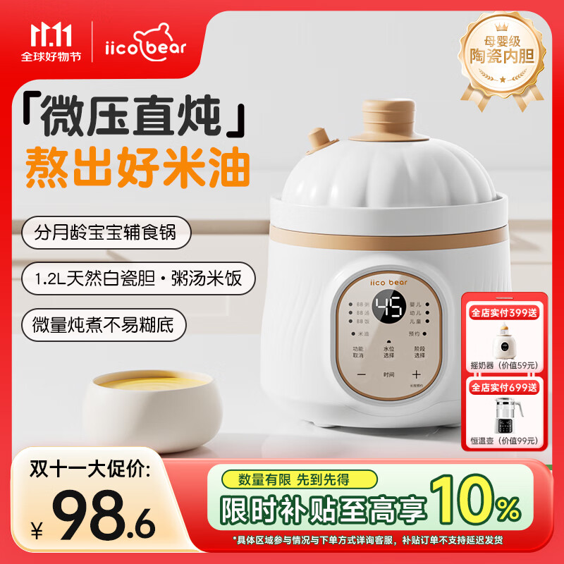 亿可熊(iicobear)电炖锅 分月龄BB煲粥饭锅婴儿专用微压炖盅 宝宝炖汤辅食锅辅食机 1.2L奶白色 【四阶段分段喂养】
